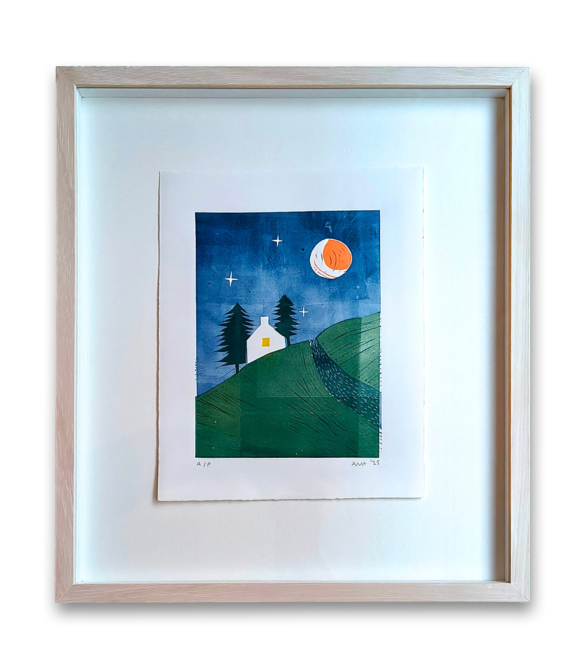 One off multi-block linocut print on Fabriano Rosaspina Bianco cotton paper.